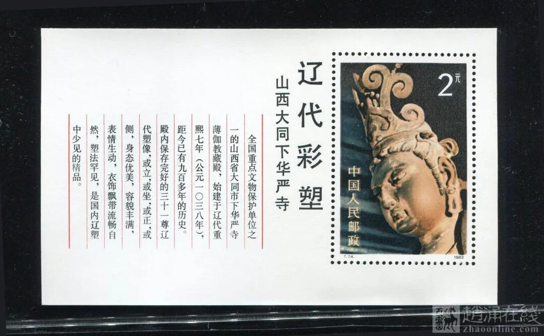 T74《辽代彩塑》小型张,是中国邮票史上佛像题材小型张的“开山之作” 。这张面值2元的邮票于1982年11月19日发行,发行量仅82万枚。设计者是新中国邮票设计大家刘硕仁。