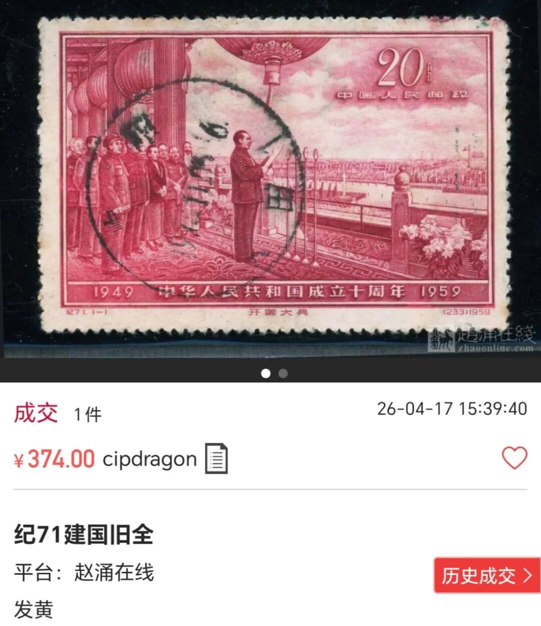 前些日子,赵涌在线上成交了一枚纪71“开国大典”信销票,成交价374元,票面标注“发黄”。有藏友问:同是信销票,为啥网上有卖两百多的,也有卖七百多的?差的钱究竟差在了哪里?今天,咱们就掰开揉碎,好好聊聊信销票收藏圈里那场永恒的话题:到底是“戳”说了算,还是“品”当家。