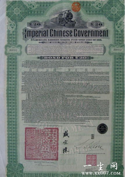 湖广铁路20英镑债券是清政府于1911年(宣统3年)在欧洲发行的债券,首次发行600万英镑,由清政府邮船部大臣盛宣怀签署,每券售价不明,到期后可以5%利息分80次偿还,近百年的文物老债券,深具史料价值。 |