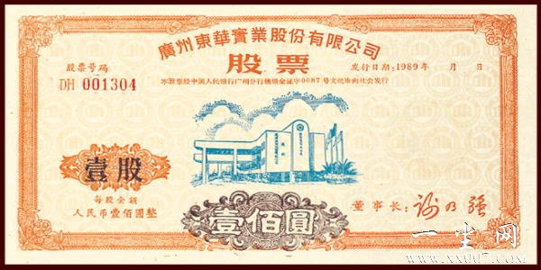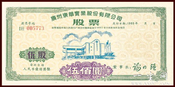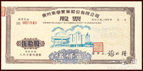 “广州东华实业股份有限公司股票”全套共有四枚:壹股(壹佰元)、伍股(伍佰元)、壹拾股(壹仟元)、伍拾股(伍仟元)。票面设计独具匠心:将东华汉语拼音缩写D.H字母巧妙地组合、构成居家小屋图案。俯视票面(采用了折光潜影技术)整个底版上布满了无数个居家小屋置于一个个地球状的空间中,寓意东华品牌,立足房产,誉满全球。此套股票防伪独特,壹股、伍股和壹拾股采用凹凸版印刷(手感明显),暗记特别,在右侧发行日期的下方有一个比一元人民币硬币略大的企业司标,其从股票水平方向看,清晰可见,极难仿造。其伍拾股防伪更为特别,既有上述凹凸版印刷、暗记防伪,又加盖了公司钢印和骑缝章、董事长印鉴,且票面尺寸比其他票面略宽。该股票在上市公司股票中的防伪独一无二,极具收藏与投资价值。