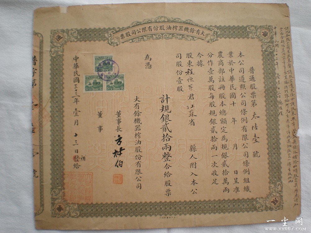 1926年美国费城世博会上,大有余公司生产的松鹤油榨油评为丙等奖